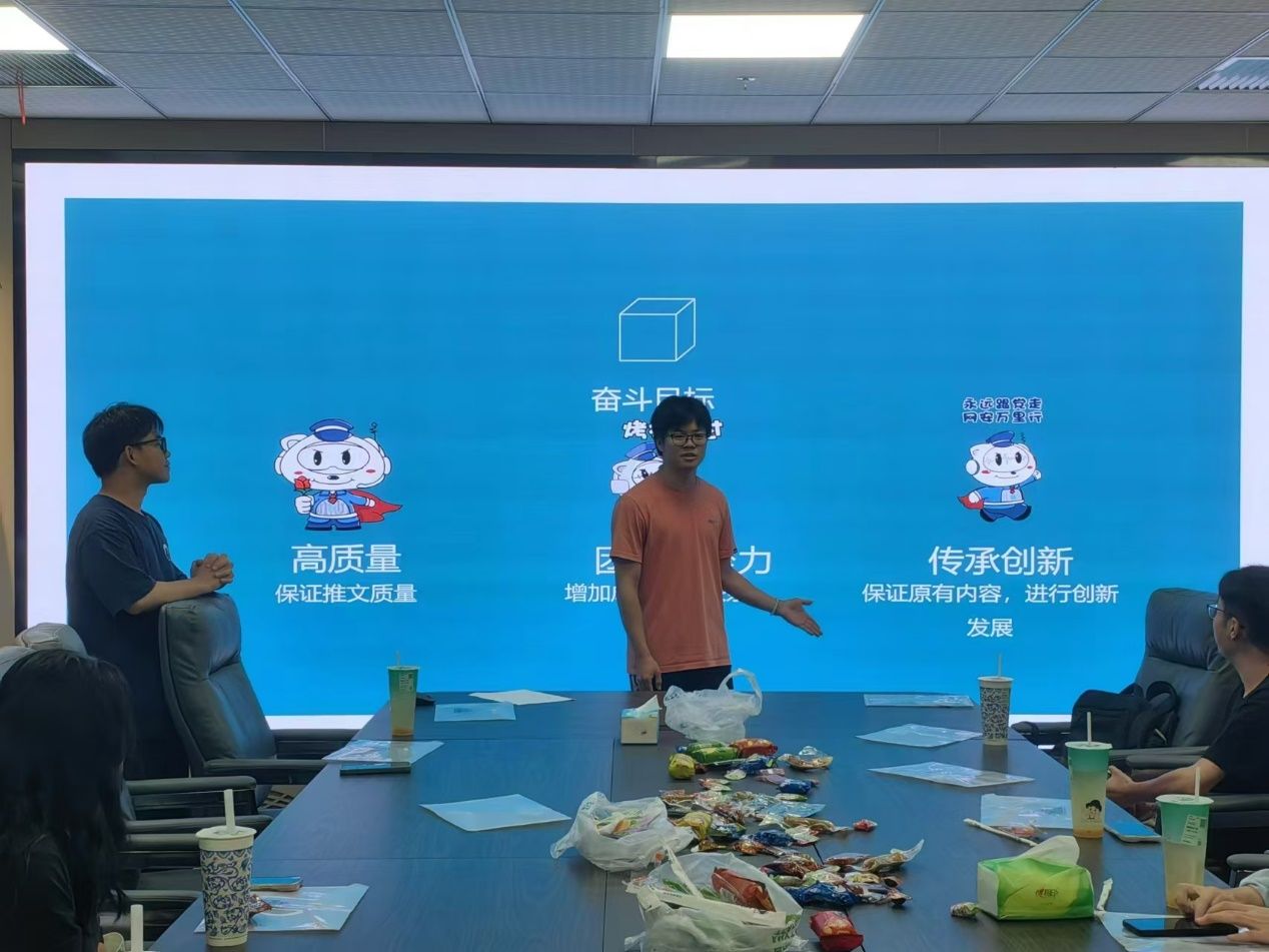 信推组主要负责西电网信院微信公众号的日常运营和推广工作,涵盖推文的编辑与排版,以及公众号内容策划与采编。信推组组长肖自强在发言中提出了三个未来奋斗目标:保证推文高质量产出、增强成员内部联系、努力做好传承创新。同时他还具体讲述了排版时的小技巧和秀米编辑器的使用方法。