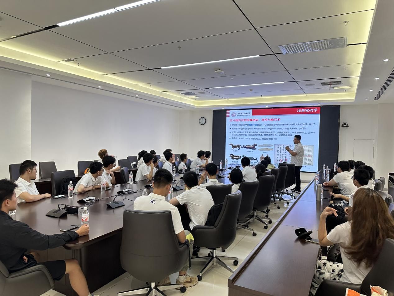 2418049班(肖国镇密码科学与技术实验班)班主任田国华老师从密码学基础知识出发,介绍了自己的求学及科研经历,展望了未来的课程教学安排,他欢迎同学在大学阶段积极寻求科研指导,希望同学们在西电传统优势学科方面持续深耕,创造更好成绩,为西电密码学科贡献自己的力量。田老师还精心设计了互动环节,同学们在与老师的互动中加深了相互了解,最后他欢迎同学们与他交流生活学习中遇到的各类问题,持续沟通。