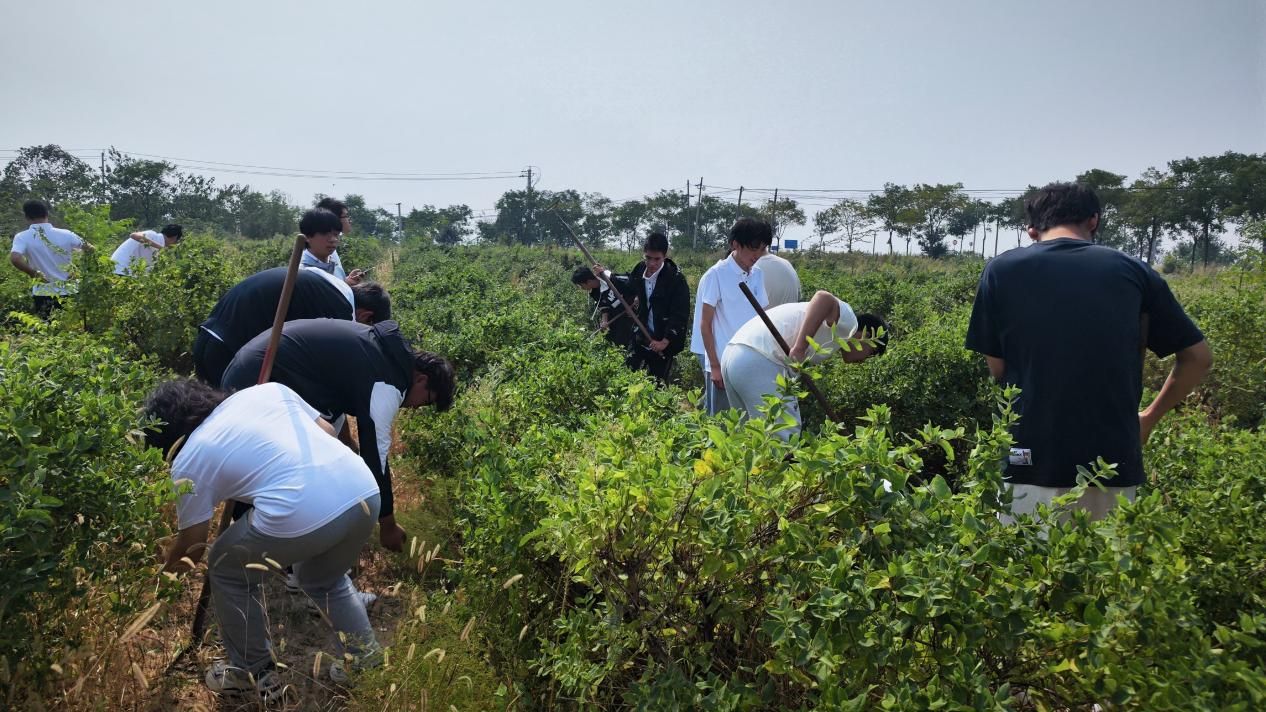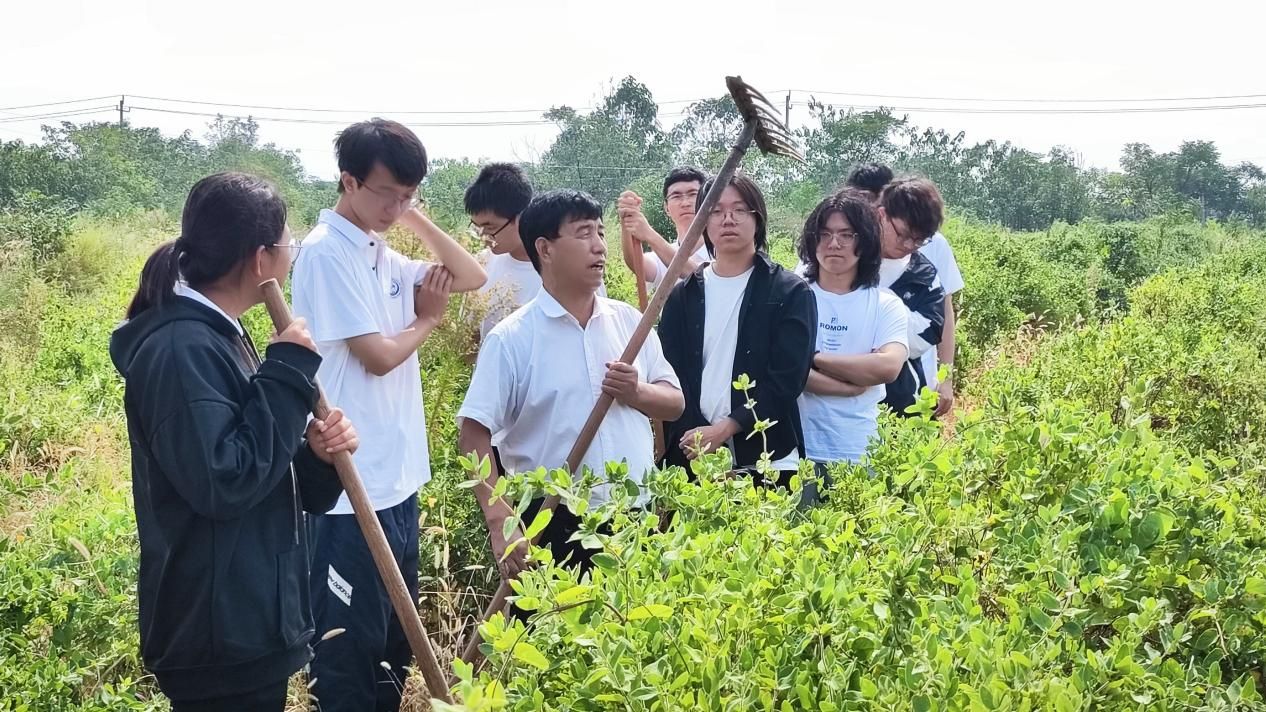 接下来,在王书记带领下,同学们到金银花种植基地参观。王书记向同学们详细介绍了金银花的种植、生长、护理等过程。此外,他向同学们介绍道,闫家村的金银花产业项目是公司积极服务乡村振兴战略所参与的乡村振兴定点帮扶项目。介绍完毕后,王书记通过亲身示范,指导同学们使用锄头、铁锹等工具在田间进行杂草清理。随后,同学们纷纷拿起各种劳动工具,在田间开展清除杂草的劳动实践。虽然天气炎热,但是同学们毫不退缩,积极完成劳动任务。