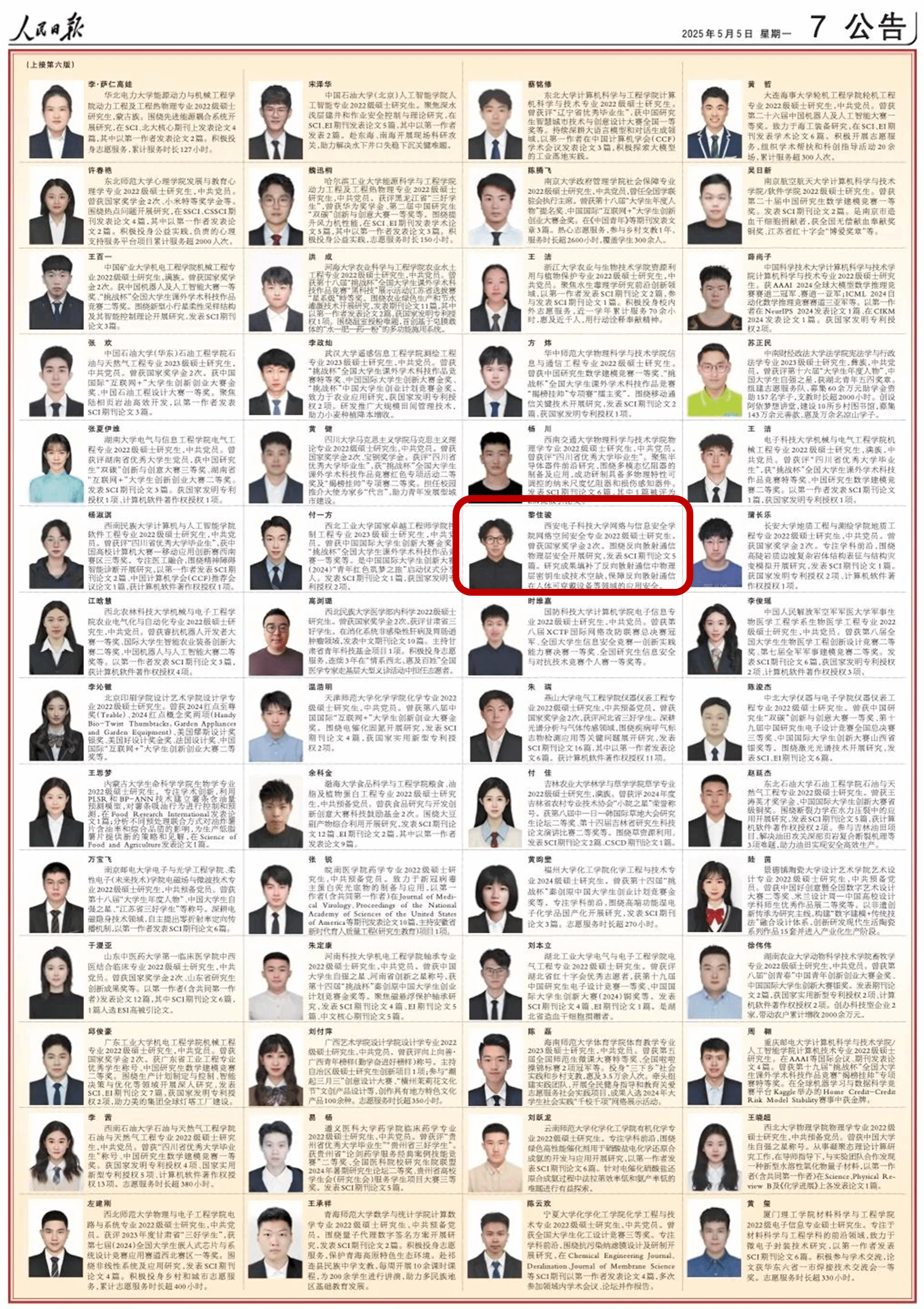 (通讯员 王慧洁)2025年5月4日,《人民日报》专版刊登《2023-2024学年度本专科生国家奖学金获奖员工代表名录》《2024年研究生国家奖学金获奖员工代表名录》,遴选出全国本专科生国家奖学金和研究生国家奖学金获奖员工代表各100名。2026年国际足联世界杯网络空间安全专业2021级本科生吕明远、网络空间安全专业2022级硕士研究生黎佳骏分别从12万名本专科生候选人和9万名研究生候选人中脱颖而出,双双入选!