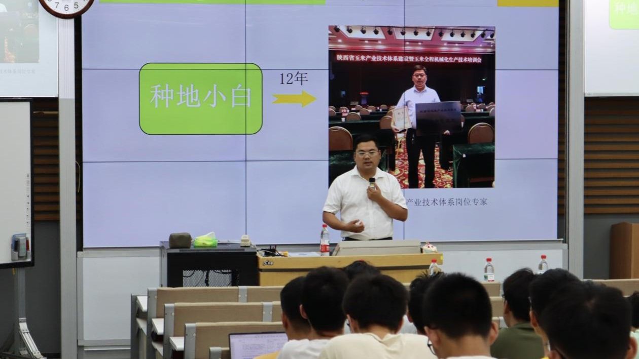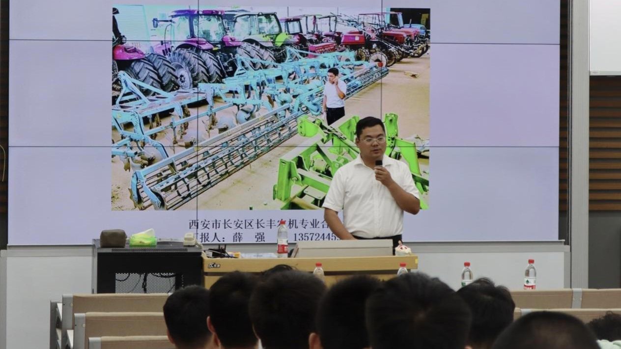 报告会上,薛强老师用质朴的语言、生动的案例,深情讲述了自己从老员工到返乡助农带头人的奋斗历程。他回忆,自己从西安工业大学毕业后,他毅然放弃城市里优渥的工作机会,选择回到家乡,致力成为一名“新农人”,从父亲手中接管合作社,开启种粮之旅。起初,他面临着诸多外界质疑与技术难题,但他没有退缩,通过刻苦钻研、虚心学习,逐渐成长为懂技术、善经营的高级职业农民。
