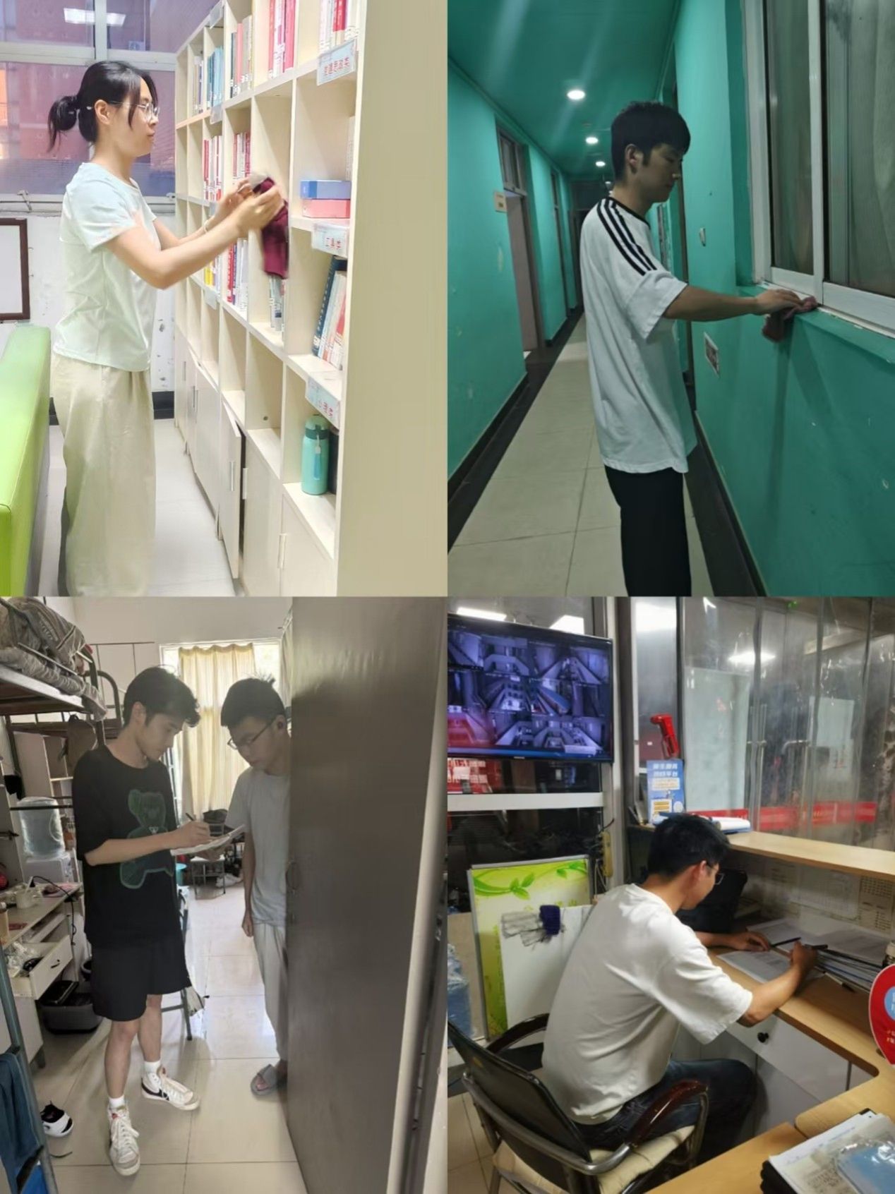 在宿舍楼区,研究生们迅速完成角色转换,化身为守护宿舍安全与整洁的 “多面手”。作为宿舍楼管理员,他们一丝不苟地进行人员进出登记,严格把控宿舍安全第一道防线;化身消防安全检察员时,仔细检查消防器材、排查安全隐患;担任房源信息核查员,认真核对每一间宿舍信息,确保数据准确无误。同时,同学们还主动拿起扫帚、抹布,清扫楼道卫生,清理卫生死角,让原本普通的楼道焕发出干净整洁的容貌,为同学们打造出温馨有序的生活环境。