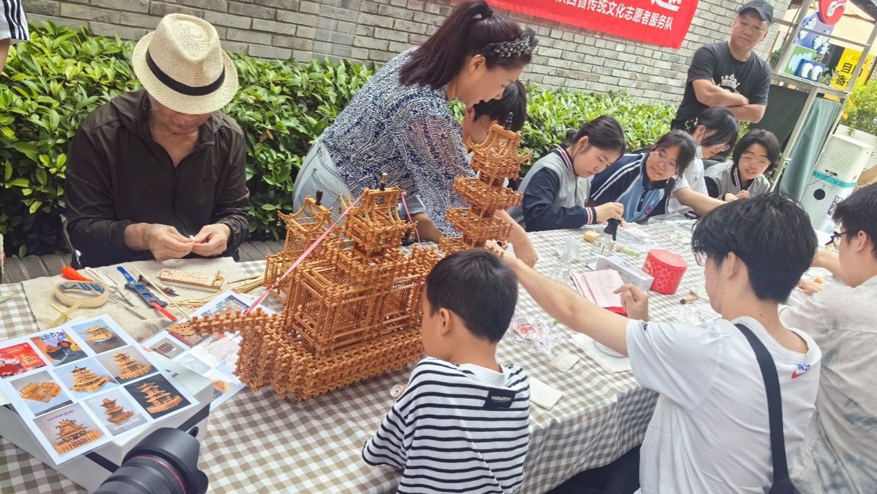 活动现场,志愿者们积极协助非遗技艺老师开展相关工作,并维持现场秩序与安全。在传统手工艺体验环节,孩子们手持着宣纸、墨汁、棕刷等拓印工具,以及形态各异的碑刻、砖瓦等拓印物件,认真学习并实践拓印技艺。非遗传承人闫敏毅老师,以生动形象的语言向参与者们介绍拓印的历史渊源、文化价值和基本流程。扎刻区,扎刻技艺传承人杨本杰老师亲临指导,他手持竹篾,运用锯、削、剪、扎等技法,将普通竹条迅速加工成粗细均匀的构件,再通过精巧的绑扎手法,将构件组合成稳固的造型。行云流水的操作,引得在场观众阵阵惊叹。