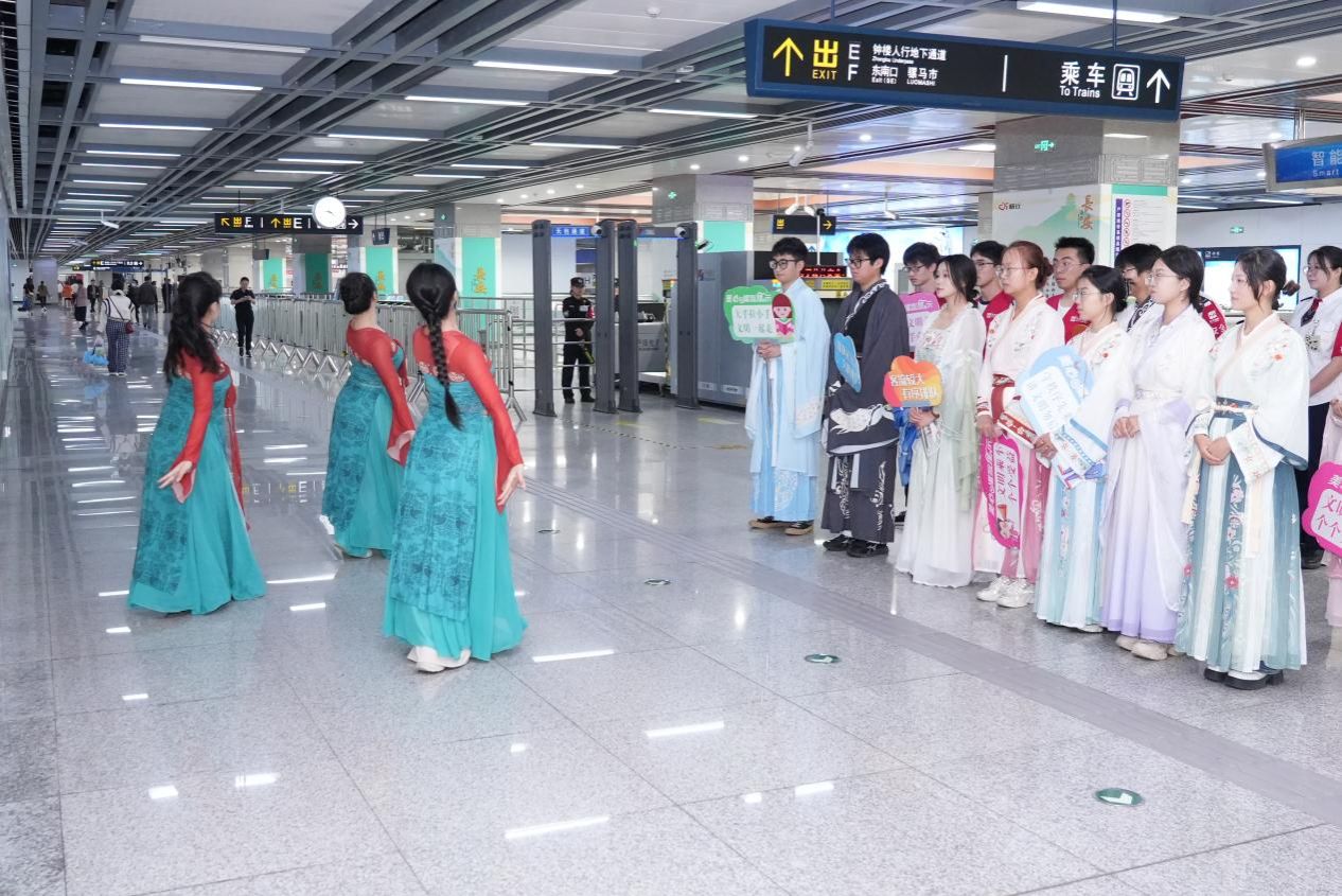 此外,站厅空旷区域的古风舞蹈表演更是点燃现场氛围。志愿者们带来的古典舞《流芳》,动作舒展优美、韵味十足,不仅吸引了众多乘客驻足观看、拍照记录,更在潜移默化中传递了“礼”的文化内涵。不少乘客表示,“第一次在地铁站看到这样的志愿活动,既欣赏到了传统舞蹈,又感受到了文明引导的温暖,很有意义。”