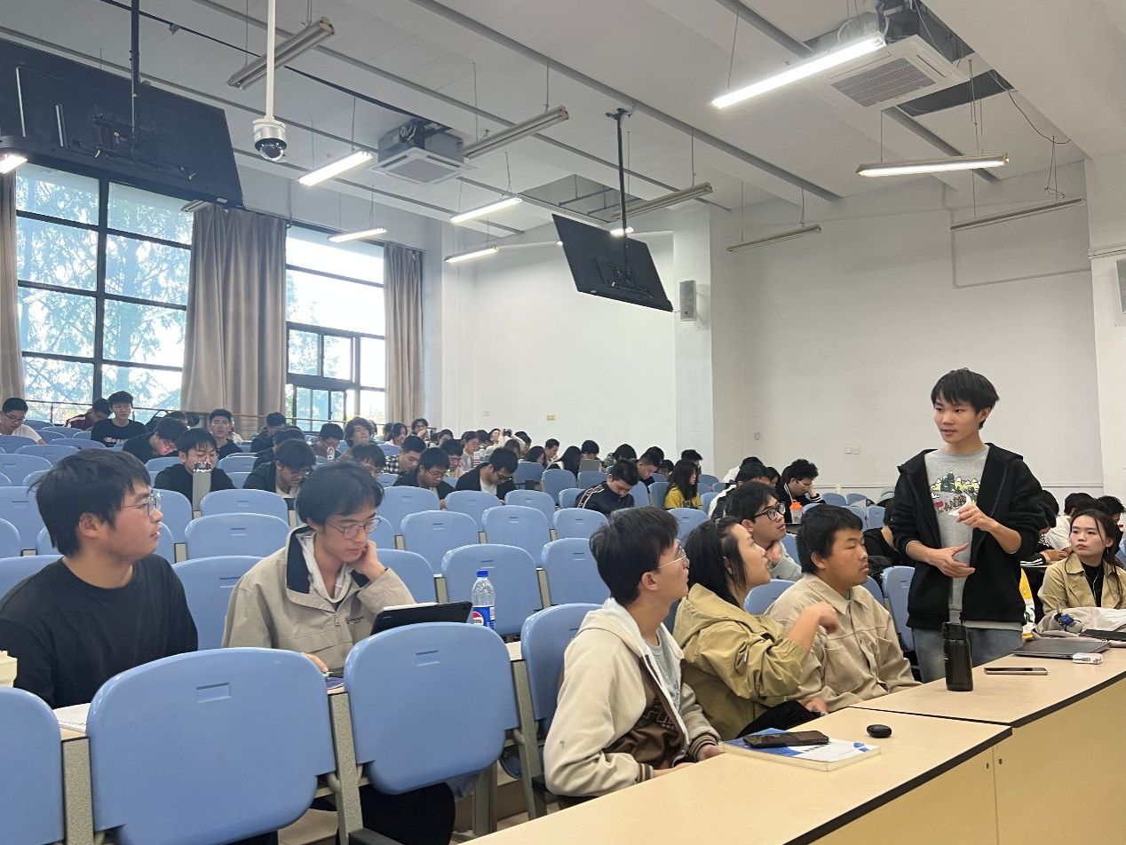 在随后的问答环节中,同学们积极提问,学长学姐耐心解答。针对同学们普遍关注的“如何平衡学业与竞赛”问题,付晗表示学习是本科阶段的首要任务,稳定的课程成绩构成专业发展的基础;竞赛则作为实践拓展的重要平台,有助于锻炼综合能力、拓宽专业视野。张俊英老师进一步强调,学业是员工发展的根本,扎实的理论基础为竞赛提供重要支撑,而竞赛实践作为课堂学习的延伸,能够有效促进知识融会贯通,是提升创新思维与解决问题能力的有效途径。当被问及“如何应对备赛期间的高压状态”时,廖鑫洋同学结合自身经历,强调了主动沟通与情绪管理的重要性。他谈到,在完成日常学习任务与竞赛攻坚任务并行的特殊时期,保持与团队、师长的有效交流是缓解压力的关键。张俊英老师则从心理调适角度出发,建议同学们可通过适当娱乐、跑步、正念冥想等方式进行主动放松,以科学方法维持良好心态,保障学习与备赛效率。