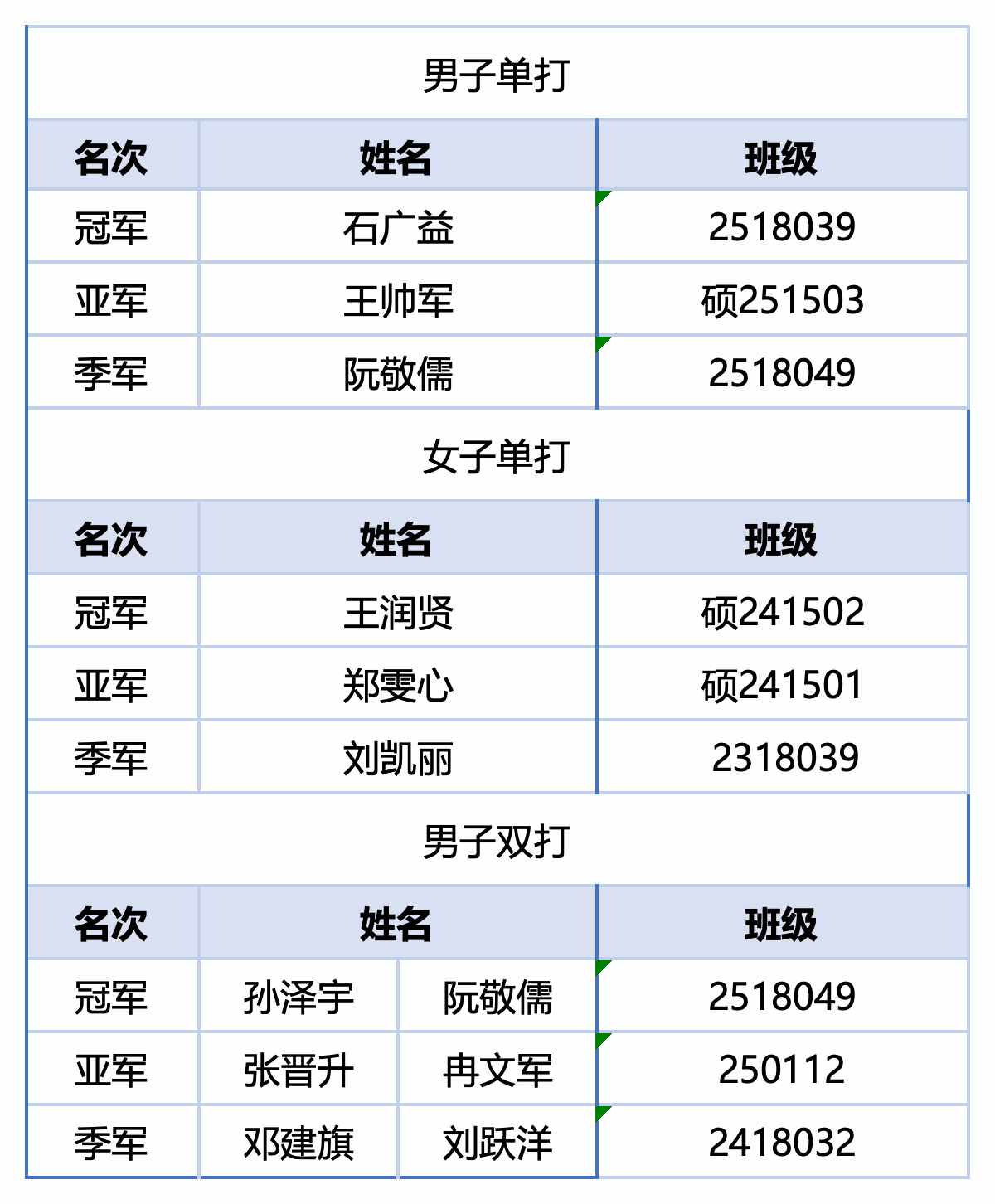 选手们以灵活的走位、精准的回球、默契的双打配合演绎着乒乓球运动的灵动与激情;场边,志愿者的细致服务保障了比赛的顺利进行,并及时应对球拍调整、赛程衔接等突发情况;场下,选手与观众的喝彩交织成青春的交响,共同定格下一幕幕扣人心弦的竞技瞬间。经过精彩的角逐,各项目冠军悉数产生:2518039班石广益、硕241502班王润贤分别摘得男子单打冠军,女子单打冠军;2518049班孙泽宇、阮敬儒组合则以默契攻防斩获男子双打冠军,充分展现网信院学子乒乓球项目的多元实力。