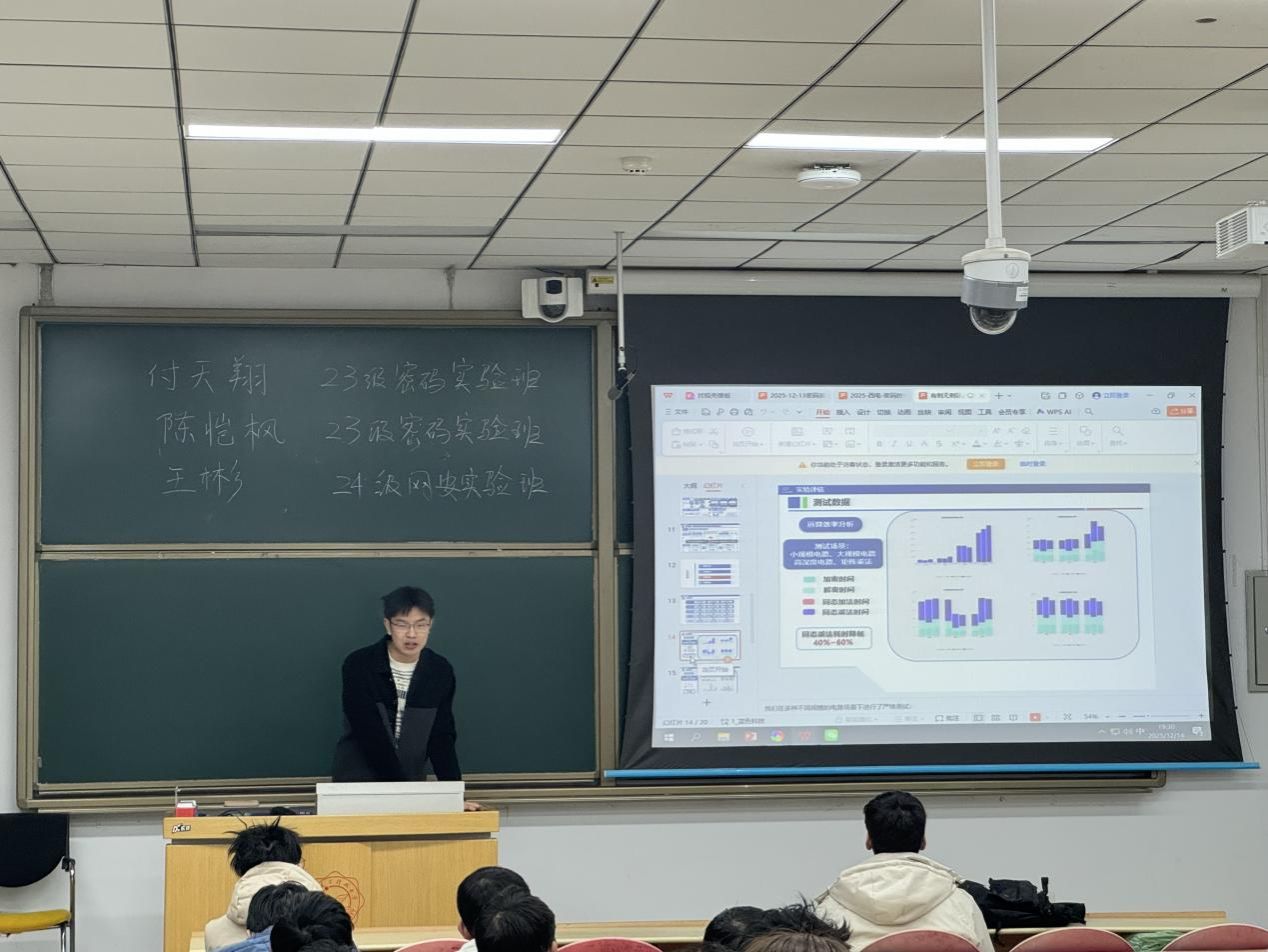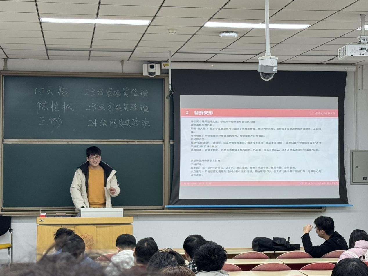 随后,付天翔同学从团队建设与分工协作的角度进行了分享。他指出,全国密码技术竞赛以团队形式进行参赛,合理的团队分工和明确的任务分配是取得好成绩的重要保障。他结合自身团队的实际情况,详细介绍了如何根据成员特长进行分工协作,高效完成理论研究、代码实现、文档撰写以及答辩现场展示等模块。此外,他还分享了在备赛过程中如何通过定期讨论、任务拆分和进度检查来提高整体效率,强调了沟通与互助在团队合作中的重要性,鼓励同学们在备赛过程中注重团队协作,相互学习、共同进步。