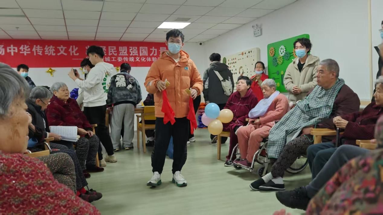 活动正式开始后,支部尹浩然同学担任主持人,以亲切的话语开场,迅速消除老人们的拘谨感,营造出温馨的活动氛围。志愿者团队首先带来《学习雷锋好榜样》合唱表演,铿锵有力的歌声传递出对雷锋精神的敬意与对老人的祝福。随后,《东方红》《没有共产党就没有新中国》等经典红歌依次唱响,现场掀起合唱热潮,老人们或跟随节奏摇摆、或用手打着拍子,与志愿者共同传唱,熟悉的旋律唤起老人们的时代记忆,现场洋溢着浓厚的家国情怀与敬老爱老的温情。