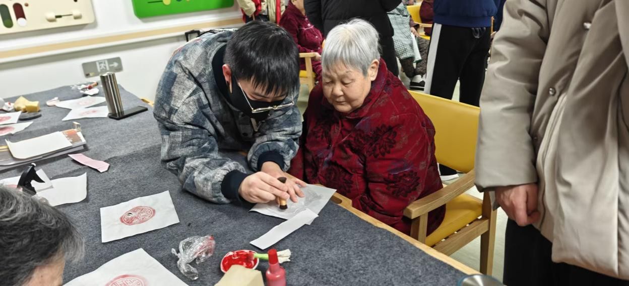 合唱环节结束后,志愿者吴昊带来快板表演,明快的节奏、朴实的语言赢得老人们阵阵掌声,为活动增添了欢乐氛围。在后续的互动体验环节,志愿者们为老人准备好拓板、墨汁、拓包等工具,开展非遗乌金拓体验活动,手把手为老人们讲解乌金拓的历史背景和操作步骤,耐心指导老人完成拓印,全程细致周到、耐心十足。