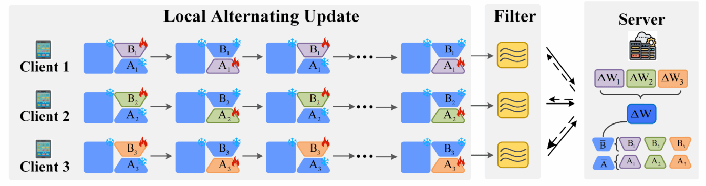 针对上述问题,我们提出了LA-LoRA框架:在每轮本地迭代中采用局部交替更新以解耦梯度干扰并抑制DP噪声放大,同时缓解全局聚合尖锐性,改善泛化能力;并可选引入高斯低通滤波平滑矩阵梯度中的高频噪声。理论分析表明,局部交替更新保证了低秩优化的稳定性和唯一闭式解。为验证方法有效性,论文在视觉和语言任务上进行了大规模实验。结果显示LA-LoRA 在严格DP约束下显著优于SOTA方法。该工作已被ICLR 2026收录。