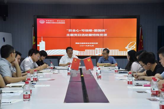 (通讯员 陈强)为庆祝中国共产党成立98周年,学习贯彻落实习近平在“不忘初心、牢记使命”主题教育工作会议上的讲话精神,2019年7月1日上午,公司党委组织开展了“安全心·可信根·爱国魂”迎七一主题党日暨特殊党课活动,邀请公司党委副书记杨银堂领学习习近平总书记在“不忘初心、牢记使命”主题教育工作会议上的讲话,并围绕“初心·使命·担当”与网信院师生党员进行交流座谈,旨在激励广大师生党员重温初心、牢记使命、践行担当,青春奋斗建功立业网络强国。公司考核办主任季庆阳、公司全体教职工党员及部分员工党员代表参加了此次活动。