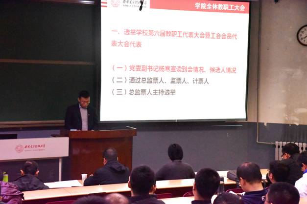 大会组织选举了公司第六届教职工代表大会暨工会会员代表大会代表。杨寒首先通报到会情况和各候选人情况,与会教师表决通过了总监票人、监票人和计票人名单,总监票人曾勇主持现场投票,最终通过差额选举,推选出7位代表。
