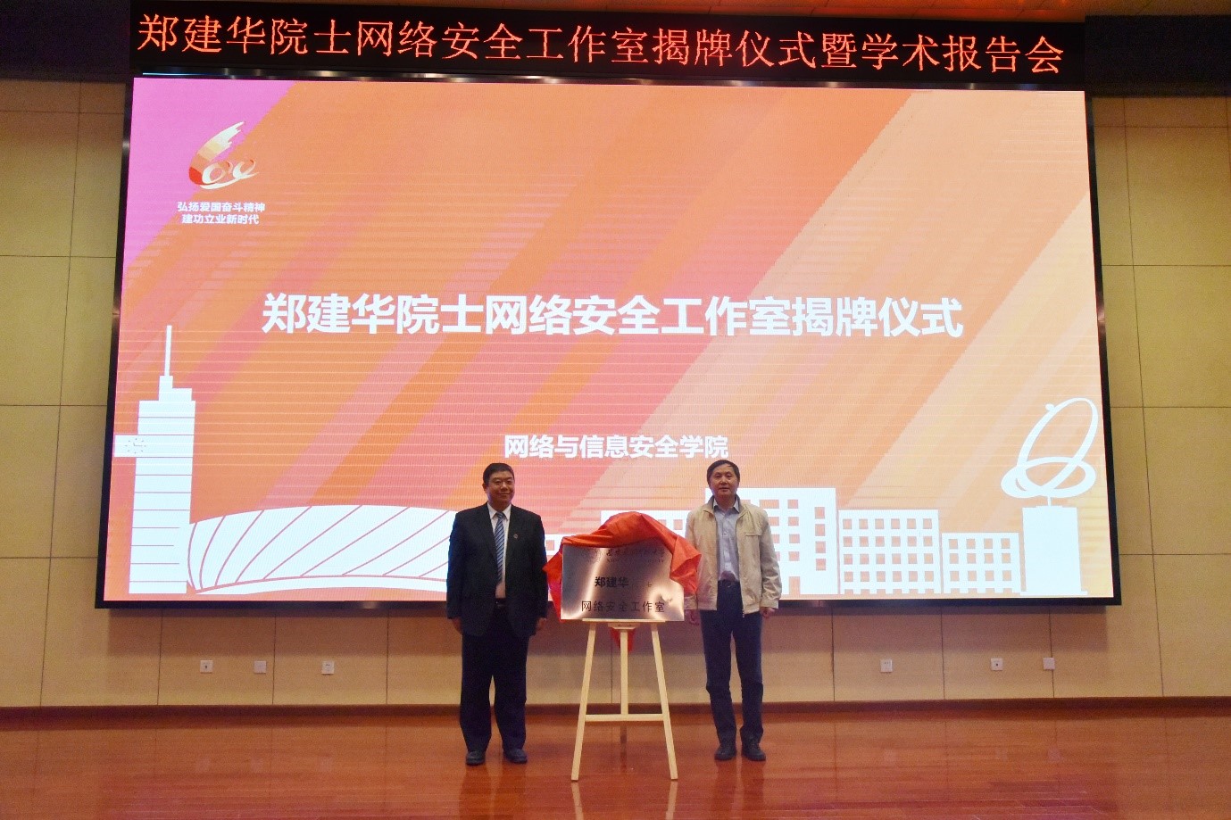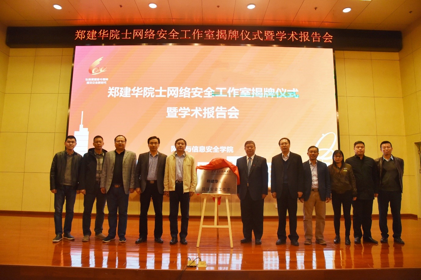致辞后,杨银堂副书记与郑建华院士为网络安全院士工作室揭牌,并合影留念。