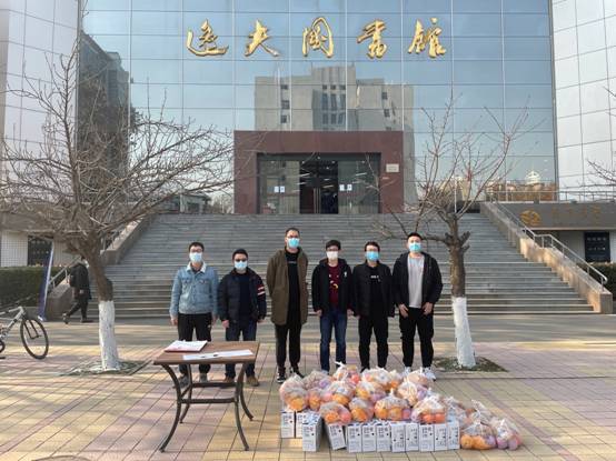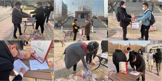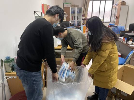 机关党支部党员安瑞凡与研究生陈明哲、邵佳杰为员工发放抗疫物资