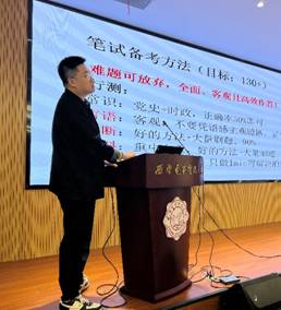 5月8日,签约党政机关和国有企事业单位的三位同学结合自身经历,从国考、省考和事业编制考试三个方面详细介绍了自己的复习策略、面试准备以及体测准备过程,分享了自己备考的心路历程及方法策略,并和现场同学们进行了深入交流,为未来有意向在相关单位就职的同学提供了宝贵经验。