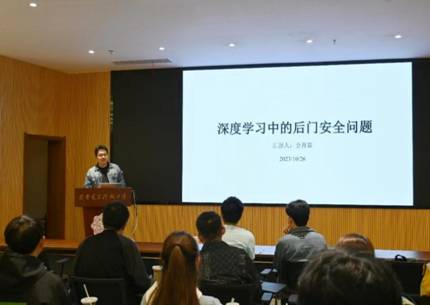 接下来,硕士研究生金育霖同学将理论与实践相结合,带来了以“深度学习中的后门安全问题”为题的分享。他在简单介绍深度学习理论的基础之上,对深度学习领域现存的安全问题进行分析,并以实例的形式向同学们展开了关于深度学习后门防御研究的讲解。金育霖同学结合自身研究,分析了深度学习领域的前沿方向和热点问题,并分享了一些科研必备的数据查询网站和学科顶会名单,建议同学们充分利用好科研道路上的好帮手。