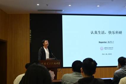 首先,博士研究生杨男子同学结合自身的科研经历,以“认真生活,快乐科研”为题,就文献阅读、寻找自己的first idea、论文撰写和投稿几个方面向同学们分享了自己的心得体会,同时表明了主动学习交流对科研之路的重要性。随后,他从如何寻找工作和生活的平衡点出发,鼓励同学们在科研工作之余培养自己的兴趣爱好,获得更加充实快乐的科研生活。