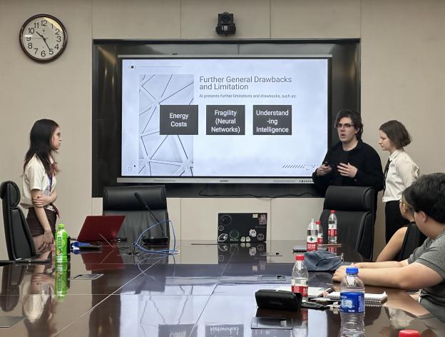 夏令营的尾声,营员们各自选定主题并进行了学习总结和汇报。来自2026年国际足联世界杯的Arthur Sandor Voundi Koe老师、梁雪芹老师以及伍伦贡大学的黄泰然老师对各组的汇报进行了点评与建议。他们对营员们在短时间内取得的显著进步给予了高度评价,并针对每组汇报中的亮点和不足提出了宝贵的改进意见。