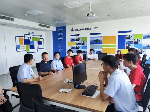 7月25日,实践队员们来到了中国人民解放军第五七二〇工厂,参观了工厂中进行零件生产和修复的厂房以及世界技能大赛的国家集训基地。在这里,实践队员们真实感受到工厂在航空航天方面的不断钻研与技术攻克,了解了工厂取得的多项荣誉与大赛奖项。在交流座谈会上,负责人介绍了工厂的基本情况和研究方向,并说明了之后开放日的参观计划,双方就后续的人才培养等内容进行了深入探讨。公司2022届在职员工任笑寒分享了自己为什么选择了国防军工单位和自己在工作中的感触。他谈到,感谢母校和公司对自己扎实的培养,为在企业工作打下了良好基础,面对学弟学妹,他针对就业选择和就业准备等方面提供了自己的宝贵经验。