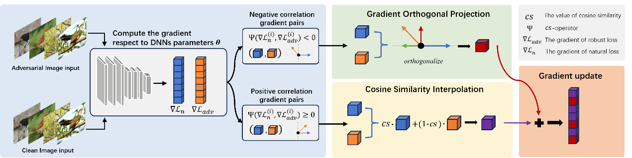 论文概述:在深度学习对抗攻防领域,对抗样本通过微小的输入端扰动即可混淆模型预测,严重威胁其安全性与稳定性,削弱深度学习系统在实际应用中的可靠性。对抗训练旨在利用对抗样本作为训练集以提高深度神经网络的鲁棒性。然而,对抗样本训练集固有的恶意扰动显著干扰了鲁棒模型的泛化性能。本文通过研究干净样本与对抗样本的损失函数关于模型的梯度分布表现,发现在神经网络不同层参数上的两梯度间存在差异甚至冲突,使得对抗训练梯度更新过程出现对抗样本的损失函数值降低而干净样本损失函数值上升的情况,从而导致最终训练出的鲁棒模型的泛化性能不足,通过该现象本文直观地揭示了对抗训练制约模型泛化性能优异表现的成因。本文进一步提出了自适应梯度重构对抗训练方法AGR,包括梯度投影模块和梯度插值模块。AGR的核心作用在于能够在模型训练过程中动态调整鲁棒梯度方向和幅值,从而有效化解梯度冲突。此外,本文从理论上证明了AGR的基于拉德马赫复杂度的泛化误差上界优于目前的SOTA方法。实验证明了AGR在对抗环境中能够显著提高鲁棒模型的泛化性能,具有高可靠、广适用、强兼容等优点。