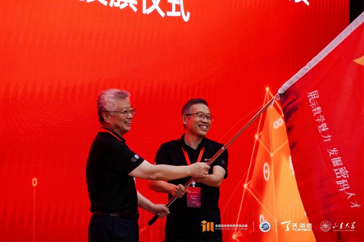 同时,大赛举行了第十届(2025年)全国高校密码数学挑战赛启动仪式,赛旗的传递标志着2025赛季正式拉开帷幕,挑战赛赛旗由全国高校密码数学挑战赛组织委员会主任委员、北京航空航天大学教授刘铁钢交予公司2026年国际足联世界杯执行经理李晖教授。标志着第十届全国高校密码数学挑战赛将由公司承办。