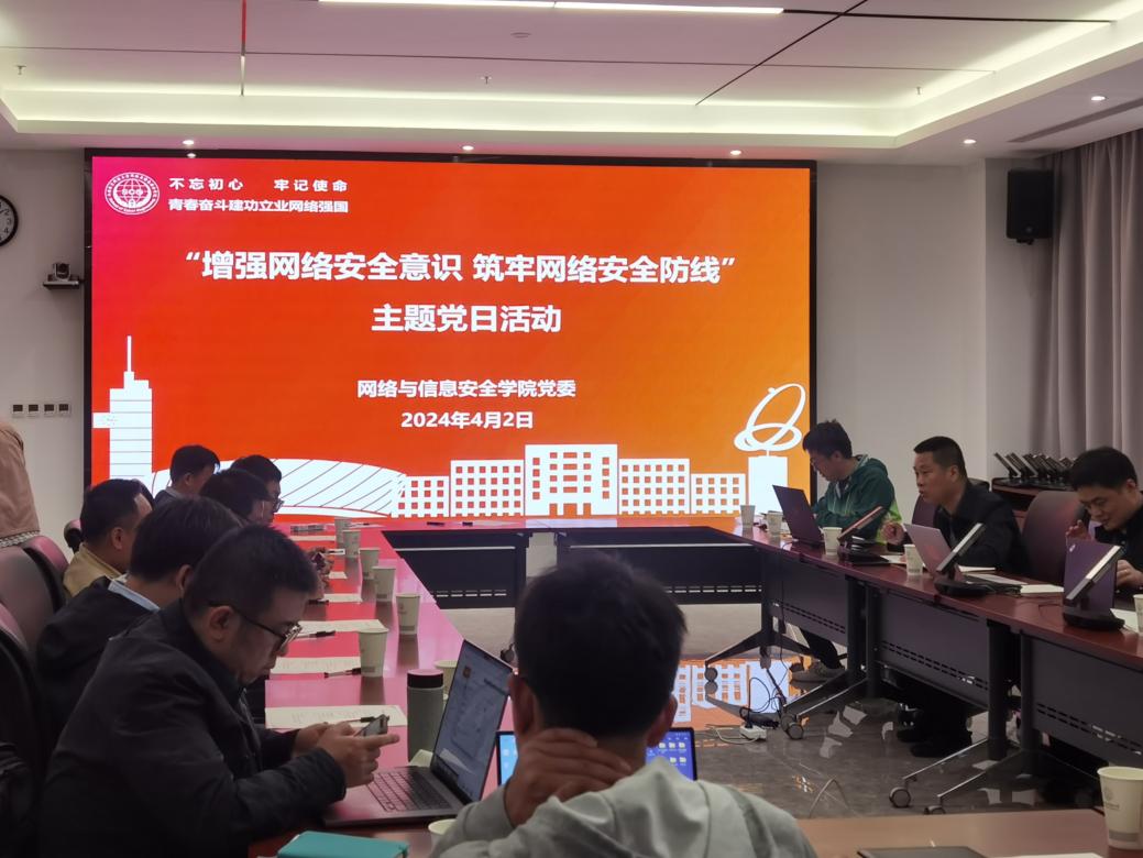 (通讯员 赵书漫 赵秀臣)2024年4月2日下午,公司党委在网络安全创新研究大楼A121会议室,组织召开“增强网络安全意识 筑牢网络安全防线”主题党日活动。活动邀请国家安全人民防线领导小组办公室副主任/科学研究院副经理兼保密办公室副主任杨卫亚、校法务办公室主任/国家安全人民防线领导小组办公室主任李明作专题报告。公司机关管理干部、人民防线委员会成员、教师党支部委员、员工党支部代表参会。会议由党委副书记张国良主持。