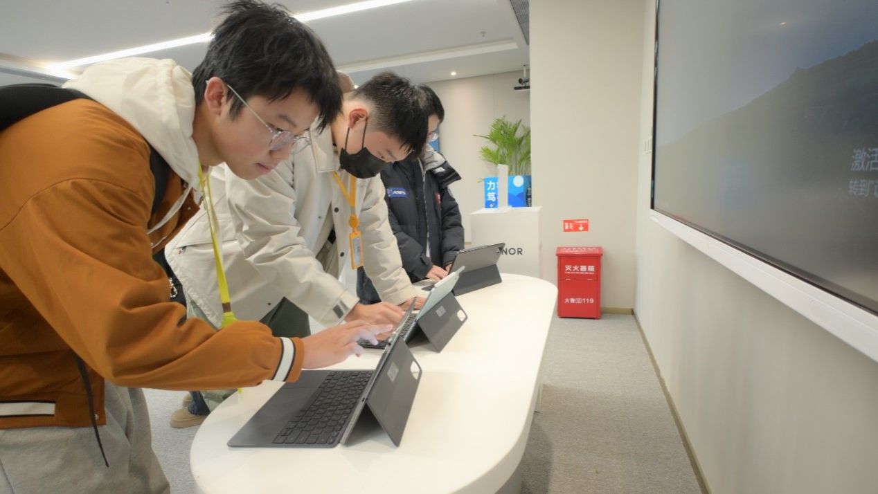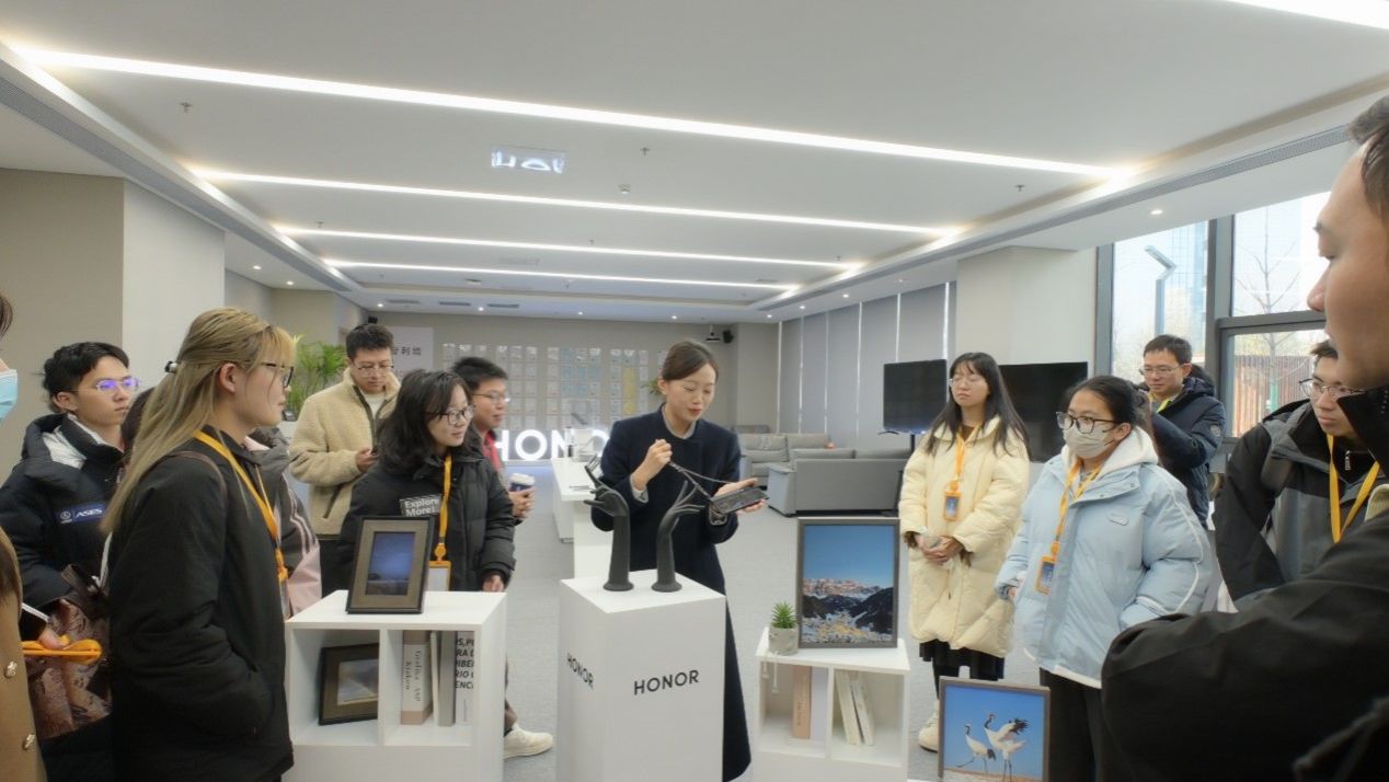进入企业展示厅,在讲解员的带领下,师生们有序进入,在这里详细了解了企业的发展历程、企业文化以及科技成果。接下来,讲解员为师生们介绍了荣耀最新款手机、平板、电脑、智慧屏、智能穿戴设备等终端产品,并邀请师生们上手体验。通过体验,同学们对荣耀公司所生产的科技产品和研发实力有了更深刻的印象。