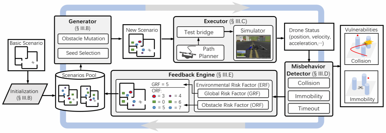 为了自动化地揭露无人机路径规划器中存在的安全关键漏洞,研究团队采用了反馈引导的场景生成模糊测试方法,设计了针对无人机路径规划器的自动化测试系统 DPFuzzer。该自动化测试系统能够生成一系列仿真飞行场景,并对配备路径规划器的无人机进行仿真测试。通过监测过程中无人机的状态和行为,发现触发路径规划器漏洞的场景。为了高效生成覆盖多种漏洞类型的多样化场景,研究团队提出了“环境风险因子”引导指标。该指标通过分析每轮测试的反馈结果,评价场景中每个障碍物及环境整体对无人机的影响,引导模糊测试器有针对性地生成下一轮测试场景,从而提高场景生成的有效性和多样性。