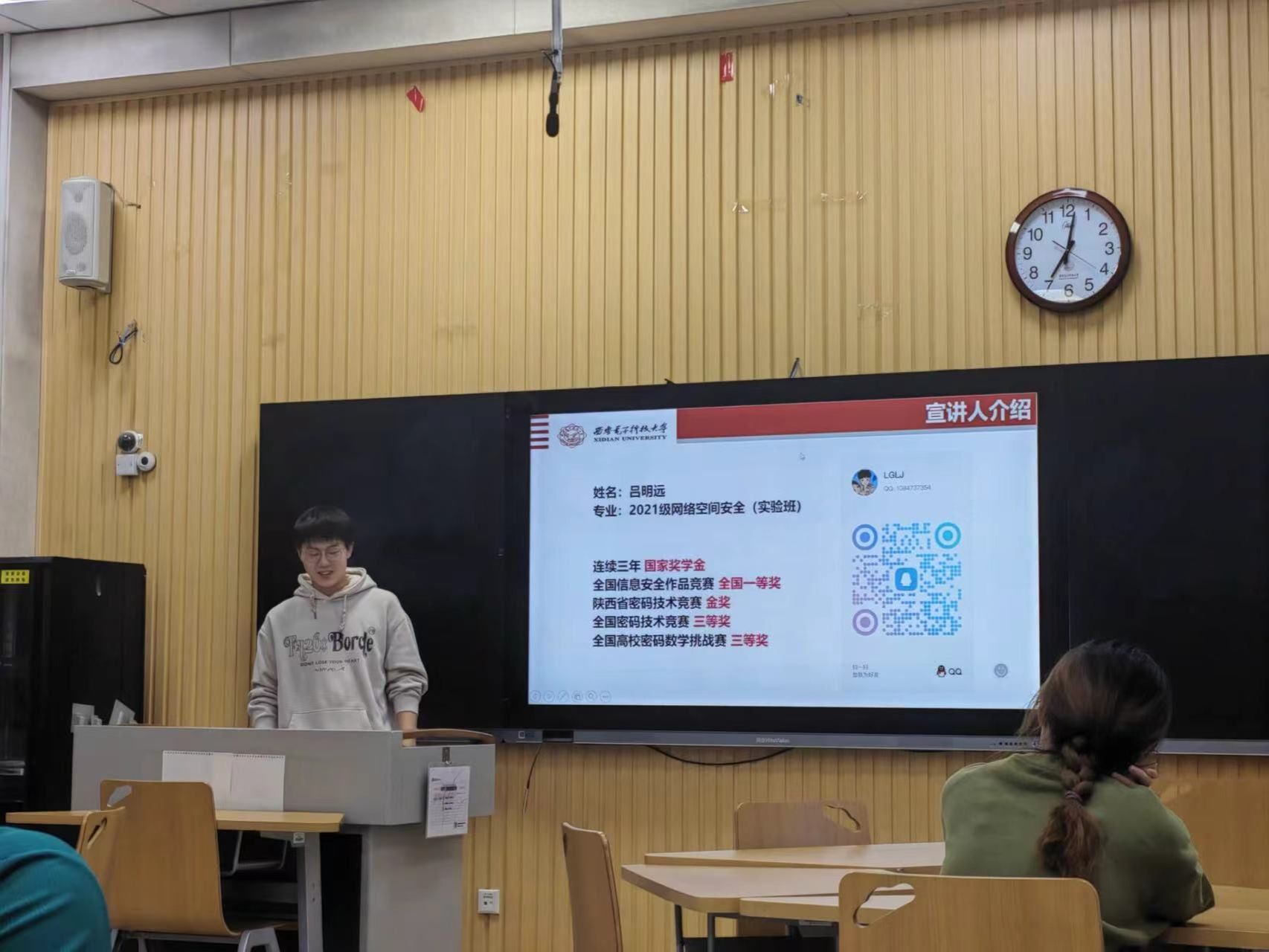 覃朗学长为同学们介绍了信息安全作品赛相关信息,他点明了需要同学们关注的三个要点,信安赛情况简介与组织、作品赛流程与培训计划、作品赛能力要求与参赛建议,并对三个要点进行具体讲解。他讲到,要掌握密码学的相关知识,要提前了解整个比赛的时间流程,要具备发现、分析、解决问题的能力;要注重和周围同学老师的沟通,提前准备,注意细节,要平衡好竞赛和期末复习的关系。此外,覃朗学长还带领同学们分析了近年来公司信安作品赛成绩,并详细介绍了优秀作品,鼓励同学们踊跃参赛。